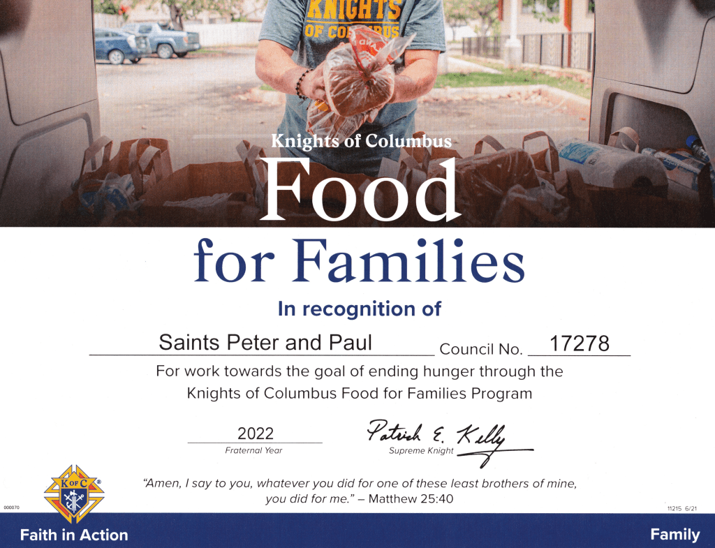 The parishioners of Saints Peter & Paul Catholic Church generously support our mission of charity with abundant donations to our community Food Bank year round. This generosity is especially evident during our annual “40 Cans for Lent” program. Scroll down for more information on this project and how you can help.