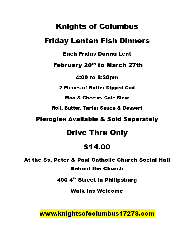 Saints Peter & Paul Council is offering two $500 scholarships in 2026. Applicants must be members of the 2026 graduating high school class and must also be confirmed Catholics as well as parishioners of Ss. Peter & Paul Catholic Church in Philipsburg. The only exception to this will be for an applicant who belongs to a parish outside of the council service area, but whose father is a member in good standing of Ss. Peter and Paul Council #17278. Applications and information on the scholarships can be found on the cry room shelf at the rear of the church. Information and forms can also be downloaded here. It’s just one more outstanding reason to become a member today. Join us this year!