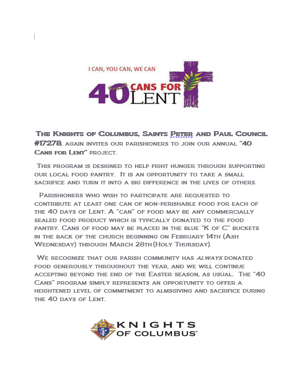 Thanks, parishioners! Your generosity has produced 2,038 pounds of donated food for the Philipsburg Food Bank at Community Action. You have made another year of the “40 Cans for Lent” program a huge success. On behalf of the Philipsburg Food Bank staff and our Knights of Columbus, God Bless You for sharing so much of your treasure with those in need.