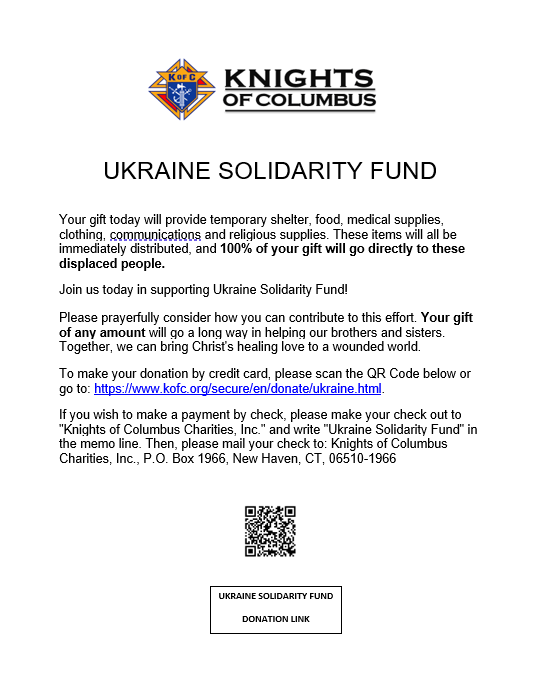 Ukraine Solidarity Fund Click here to make a secure donation: https://www.kofc.org/secure/en/donate/ukraine.html Share this: Click to share on Facebook (Opens in new window) Facebook Click to share on X (Opens in new window) X Click to share on Pinterest (Opens in new window) Pinterest Click to share on LinkedIn (Opens in new window) LinkedIn More Click to share on Reddit (Opens in new window) Reddit Click to share on Threads (Opens in new window) Threads Click to share on Bluesky (Opens in new window) Bluesky Click to email a link to a friend (Opens in new window) Email Like Loading...